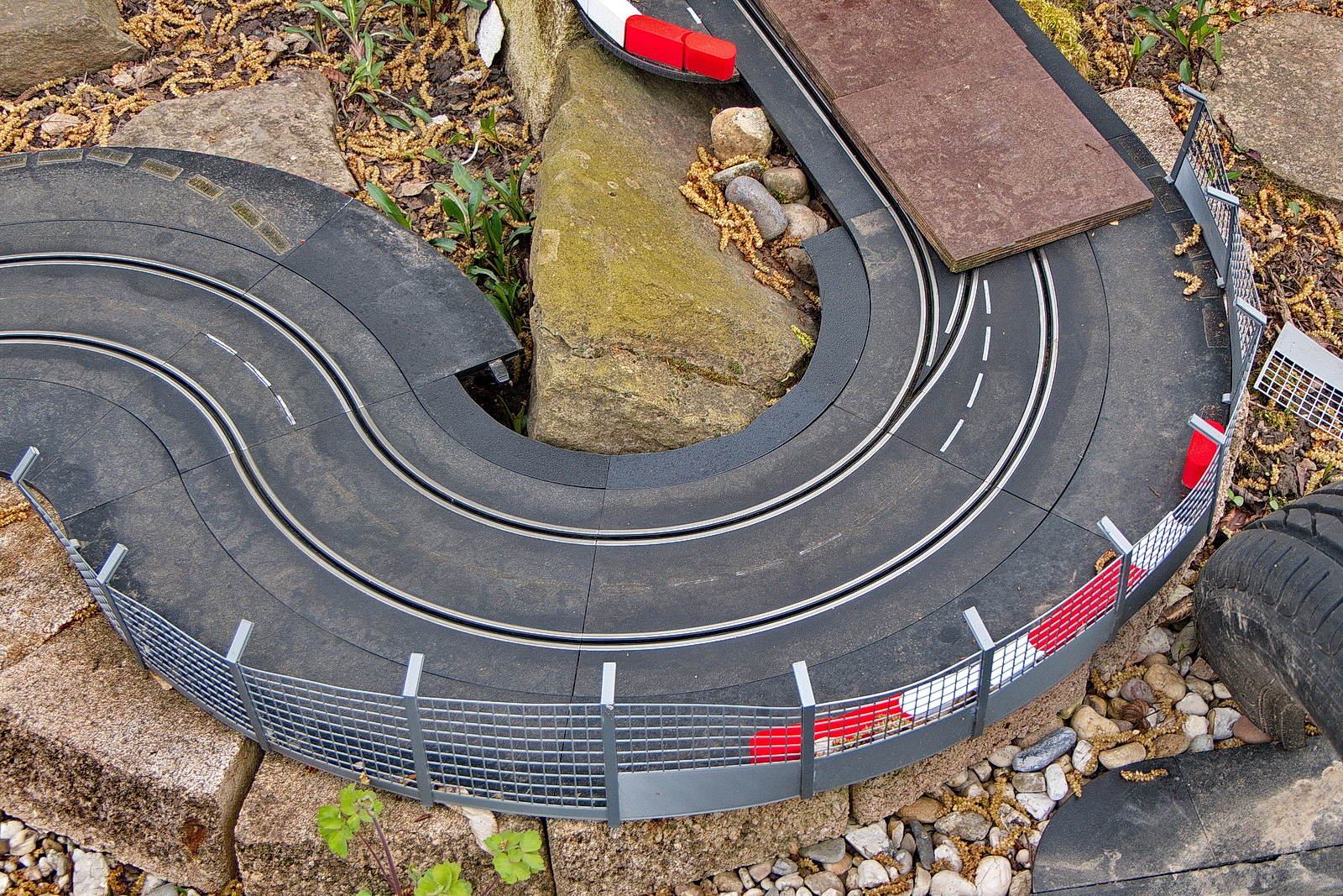 2016, beim DTM-Rennen in Nürnberg, war die Firma Carrera mit einer großen Bahn im Fahrerlager vertreten. Irgendwie kam ich dann auf die Idee, mal unsere alte "Racy-Bahn" aus dem Keller zu holen und aufzubauen. Natürlich war das kein Vergleich zu Carrera und somit hab ich dann mit Unterstütung meiner Frau mich entschieden, die Bahn zu verkaufen und auf Carrera umzustellen. Immer mehr Zubehör und neue Autos wurden gekauft und die Bahn öfter im Wohnzimmer als "Teppich-Rutscher" aufgebaut. Irgendwann kam auch der Wunsch, eine Bahn fest aufzubauen. Der Platz im Haus ist aber eingeschränkt. In Lüdenscheid hat ein Slotter eine Bahn im Garten aufgebaut, die er in den warmen Monaten betreibt. Mein Sohn und ich haben sie uns angeschaut und waren begeistert. Trotzdem hat es noch etwas gedauert, bis wir auch den Mut gefasst haben, den Garten umzugestalten. 2019 ist es dann passiert und wir haben es nicht bereut. Die Bahn wurde inzwischen umgebaut, zusätzlich haben wir 2021 einen kleinen Platz für eine Kellerbahn im Haus gefunden.